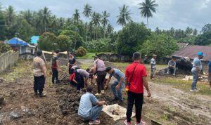 Di Desa Doitia, Kecamatan Loloda Utara, personel Satbrimob terlihat bekerja bahu-membahu dengan tim gabungan dan masyarakat setempat.