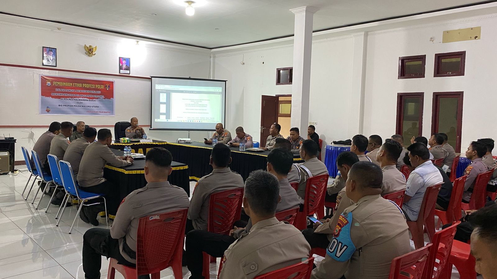 Polres Halmahera Barat menggelar kegiatan sosialisasi Pembinaan Etika Profesi Polri dalam rangka mencegah perilaku menyimpang dan pelanggaran personel. Kegiatan ini dilaksanakan di Aula Vikon Polres Halbar dan dihadiri oleh Tim dari Bid Propam Polda Maluku Utara.