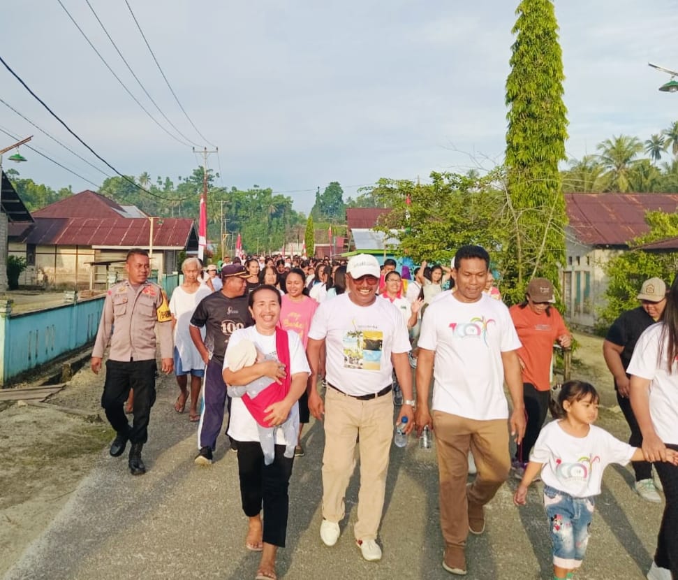 Kegiatan jalan pagi yang diselenggarakan oleh Masyarakat Desa Leo-Leo Rao, Kecamatan Pulau Rao bersama Anggota Bhabinkamtibmas Kamtibmas pada acara HUT Ke-100 Tahun Desa Leo-Leo Rao. (Rabu, 25/06/2025).