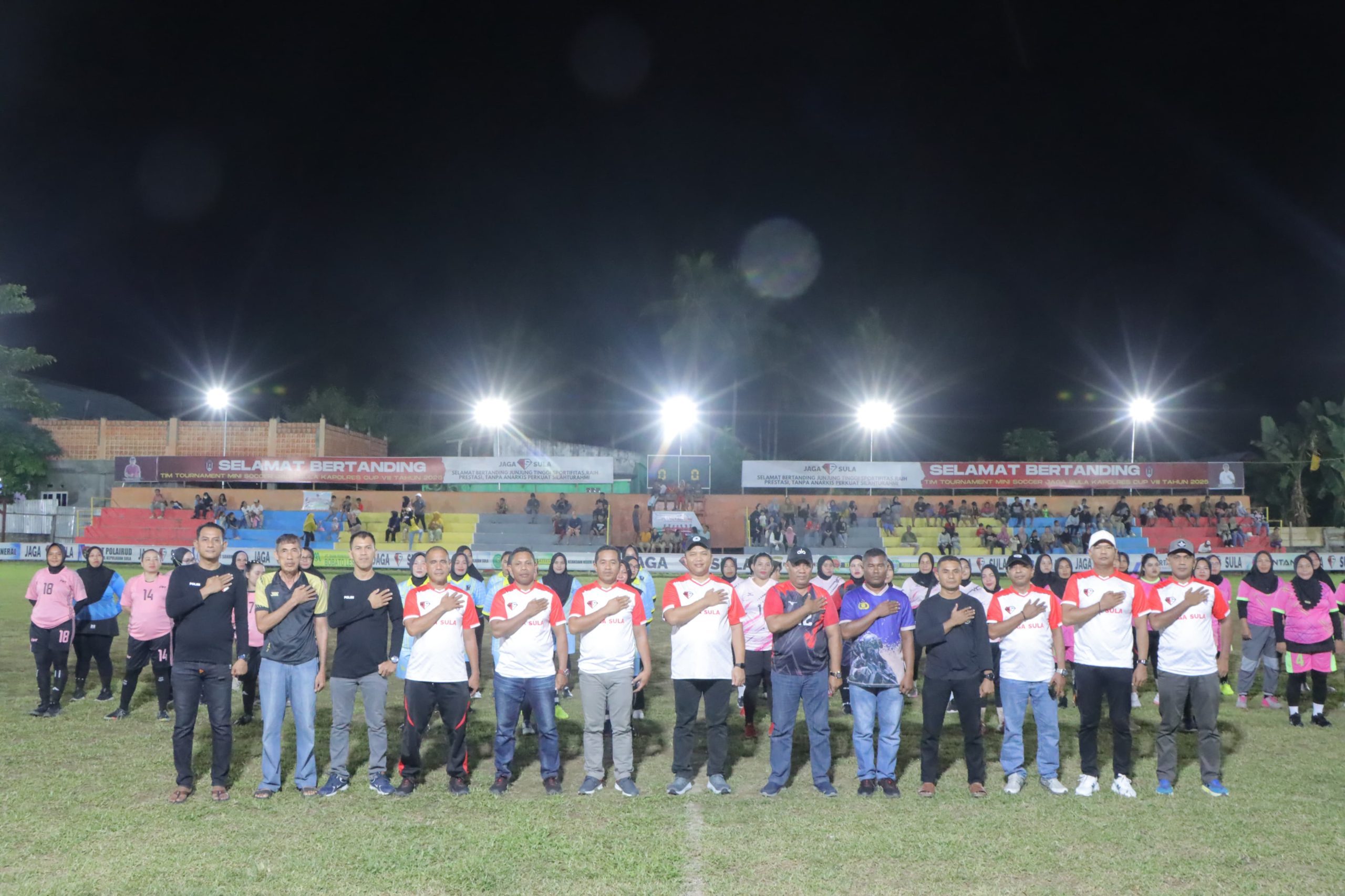 Kepolisian Resor Kepulauan Sula menggelar pertandingan bola dangdut dalam rangka memeriahkan menjelang Hari Ulang Tahun (HUT) Ke-79 yang berlangsung di lapangan bola Gelora Bhayangkara Kesatriaan mako Polres Sula, Minggu malam (15/6/2025).