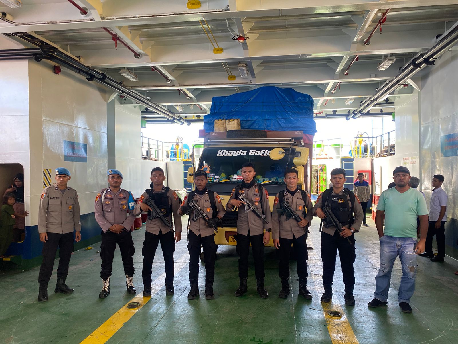 Dalam rangka mengamankan distribusi kotak suara, personil Dit Lalulintas dan Samapta Polda Malut gencar melakukan pengawalan ketat di Pelabuhan Ferry Bastiong.