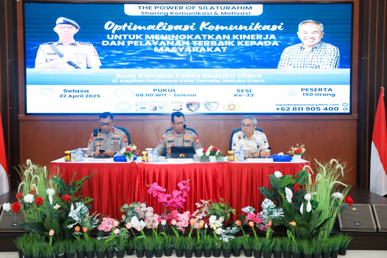 Kegiatan yang bertajuk Sharing Komunikasi dan Motivasi dengan tema _Optimalisasi Komunikasi untuk Meningkatkan Kinerja dan Pelayanan Terbaik kepada Masyarakat_ tersebut dilaksanakan di Aula Kieraha Polda Maluku Utara yang dihadiri oleh Wakapolda, Pejabat Utama Polda Maluku Utara, personel dan Bhayangkari.