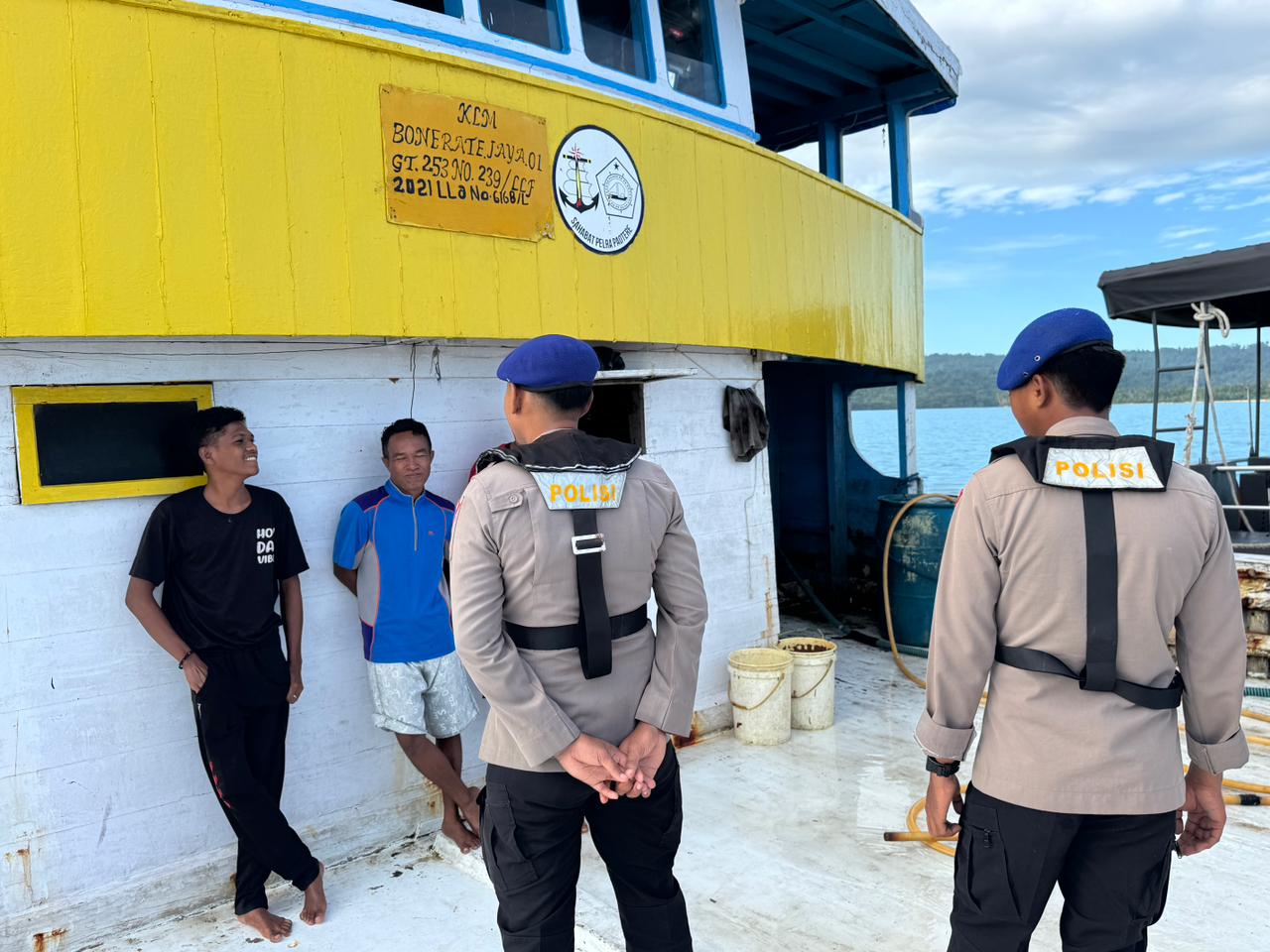 Direktorat Polisi Perairan dan Udara (Polairud) Polda Maluku Utara melaksanakan patroli sekaligus menyampaikan imbauan keselamatan kepada para penumpang dan motoris kapal di Pelabuhan Bastiong, Senin (16/6/2025).