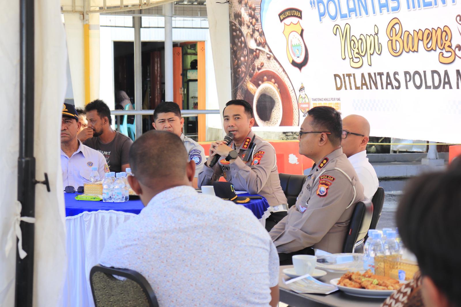 Direktorat Lalu Lintas Polda Maluku Utara menggelar kegiatan “Polantas Menyapa” dalam bentuk Ngopi Bareng bersama Asosiasi Pengemudi Truk Lintas Provinsi Maluku Utara di Pelabuhan Ferry Bastiong, Kota Ternate, Jumat (4/7).