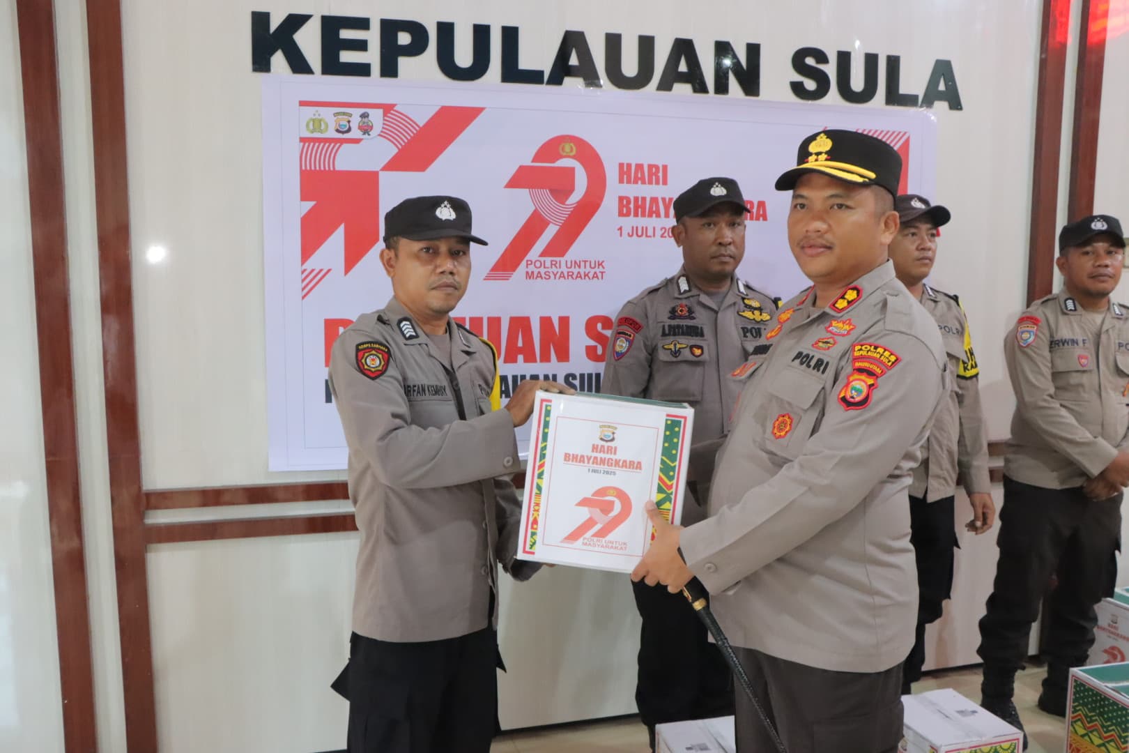 Kepolisian Resor Sula membagikan ratusan Bantuan Sosial (Bansos) kepada masyarakat dalam rangka memperingati Hari Ulang Tahun (HUT) Bhayangkara Ke-79 Tahun 2025 yang berlangsung di Lobi Mako Polres Sula, Jumat (13/6/2025).