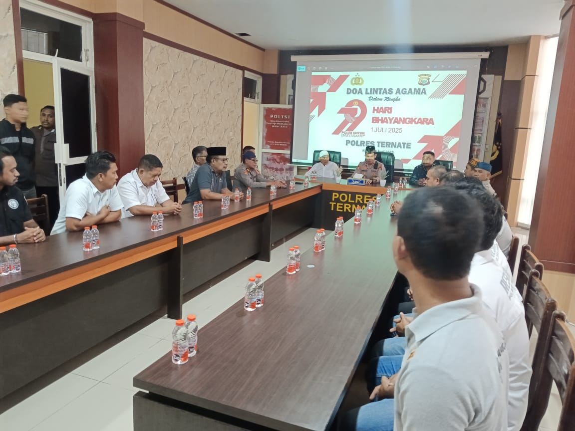 Kepolisian Resor Ternate menggelar kegiatan Doa Lintas Agama dalam rangka menyambut Hari Bhayangkara ke-79 di ruang TMCC Lantai II Mapolres Ternate, Rabu (25/6/25).