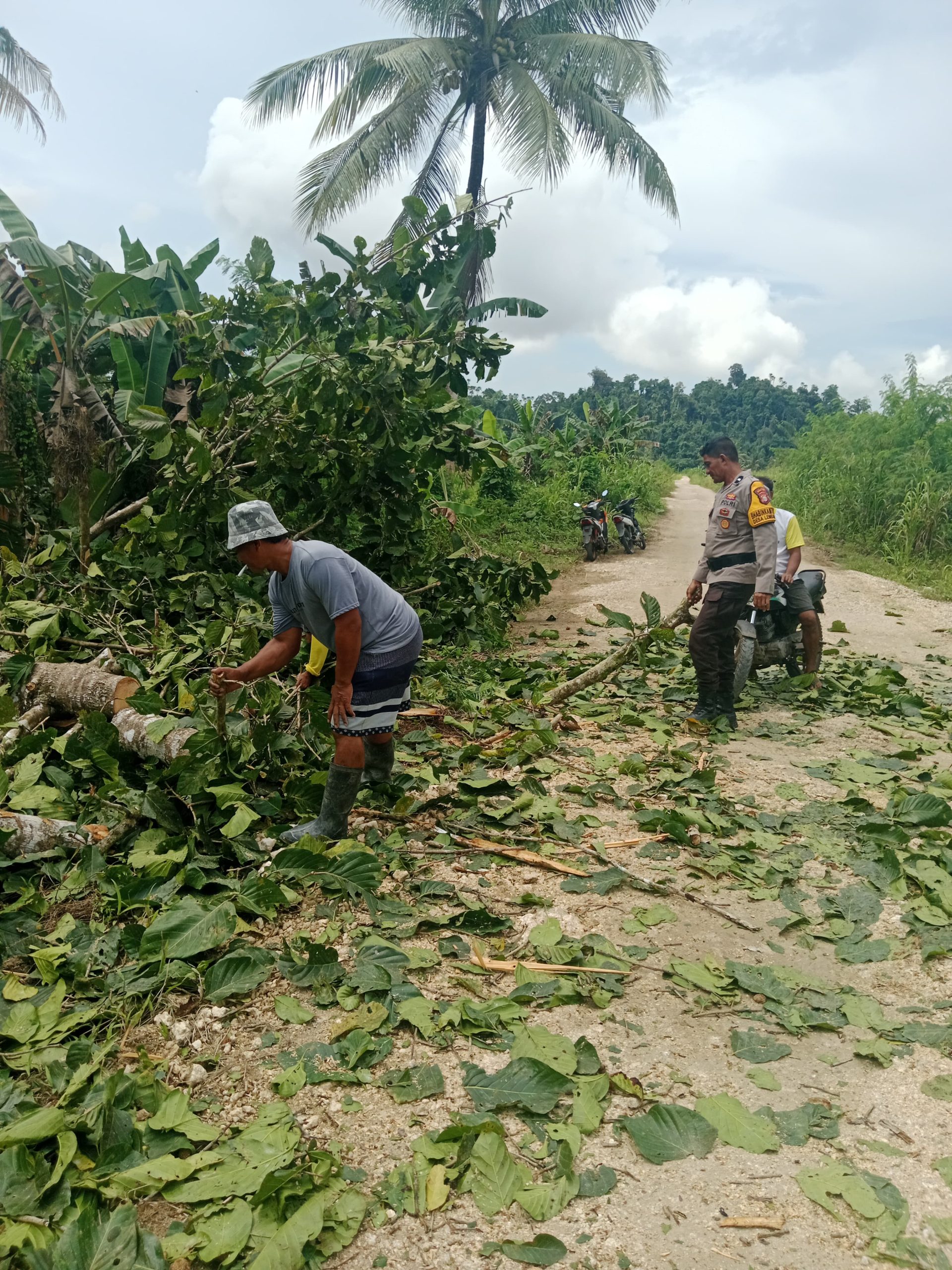 Dengan menggunakan peralatan seadanya, tampak Bhabinkamtibmas bekerja sama dengan warga membersihkan puing-puing pohon yang menutupi jalan. Proses pembersihan berlangsung lancar dan jalan kembali dapat dilalui oleh kendaraan dalam waktu singkat.