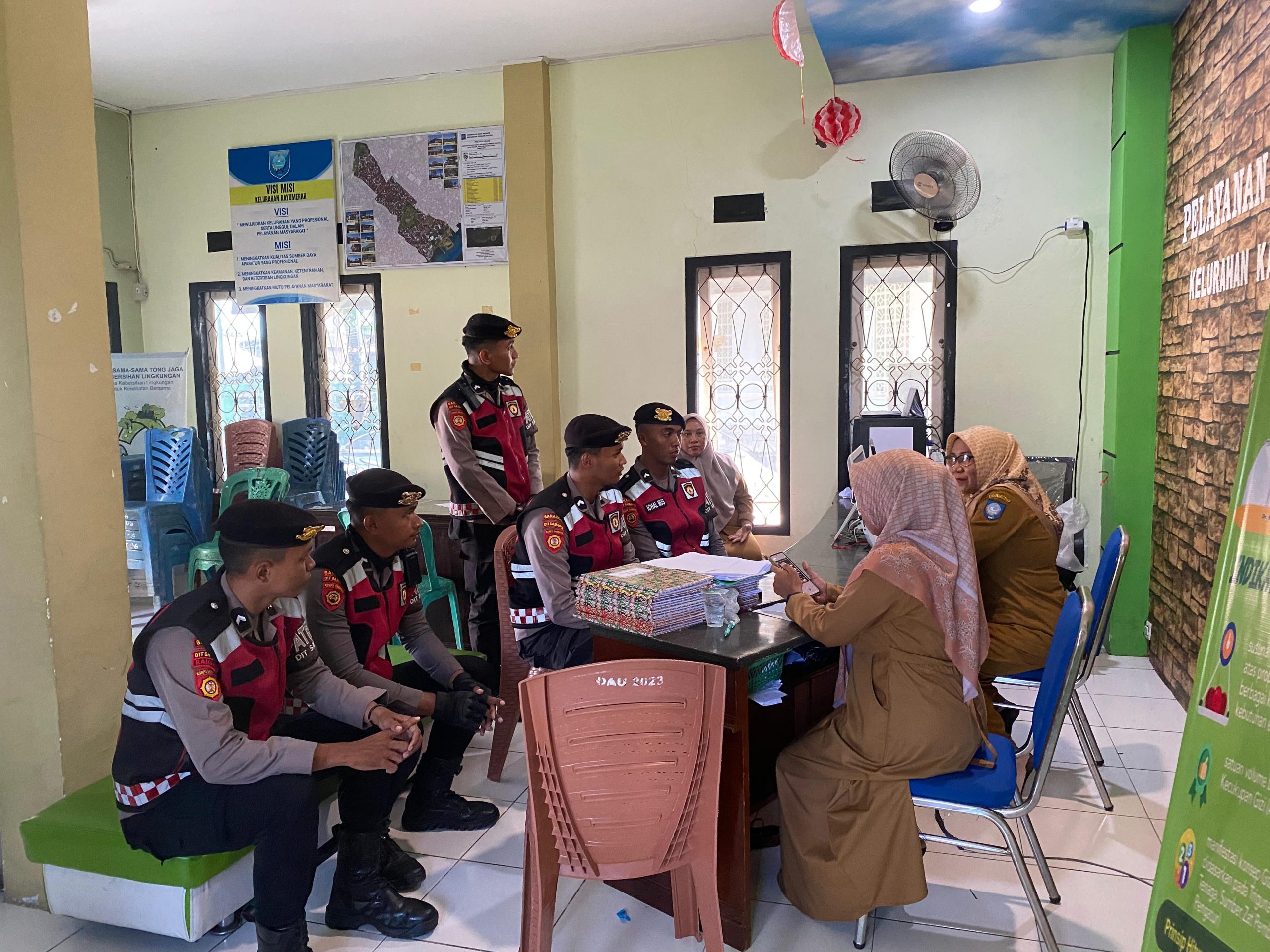 Selain patroli, personel juga melaksanakan sambang dan dialogis dengan staf Kelurahan Kayu Merah guna menyampaikan imbauan kamtibmas dan membangun komunikasi aktif dengan aparatur kelurahan.
