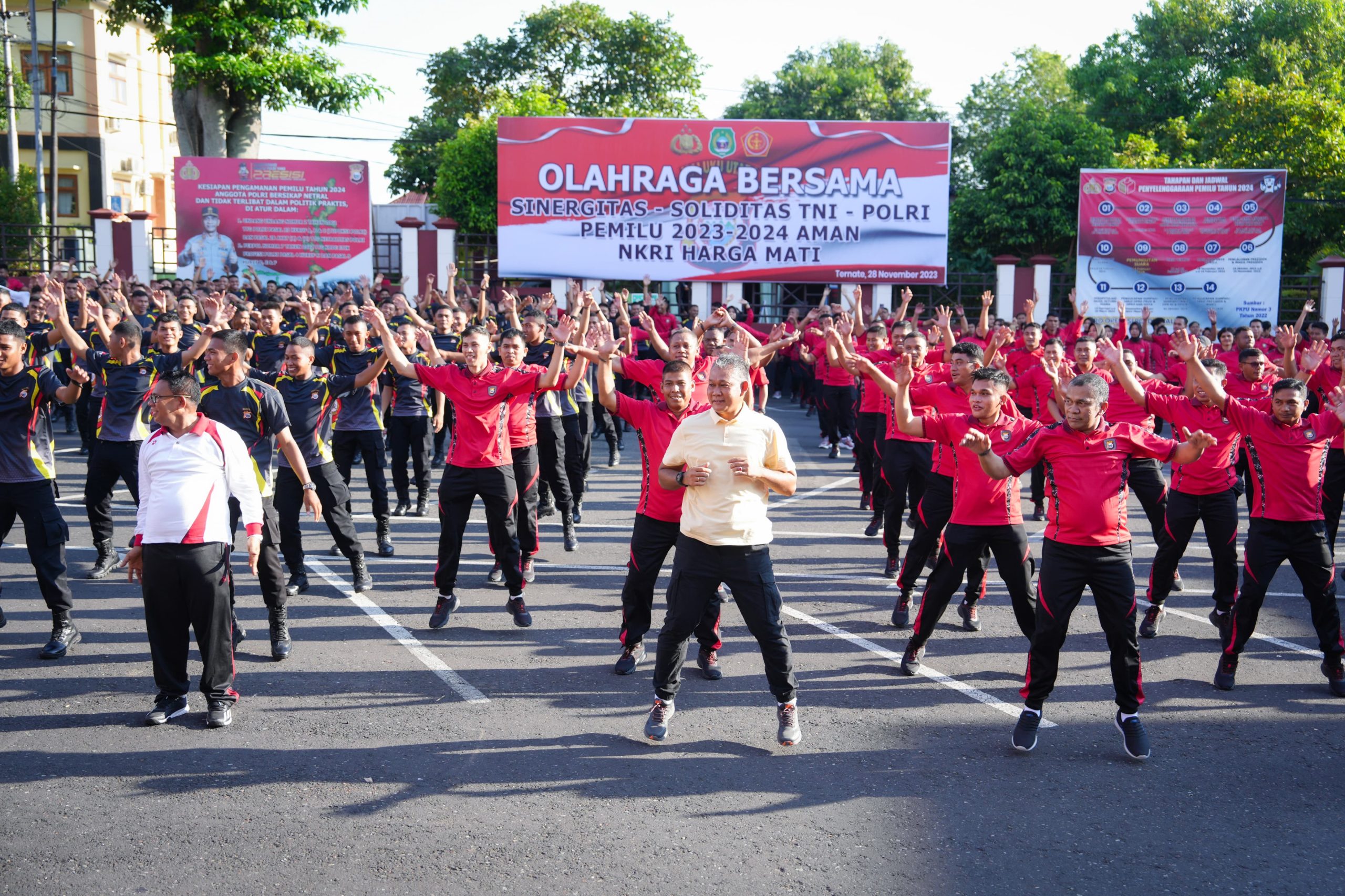 Kapolda Malut Irjen Pol. Midi Siswoko memimpin kegiatan olahraga bersama TNI di Mapolda Malut pada Selasa (28/11/23) dalam upaya meningkatkan sinergitas TNI-POLRI.