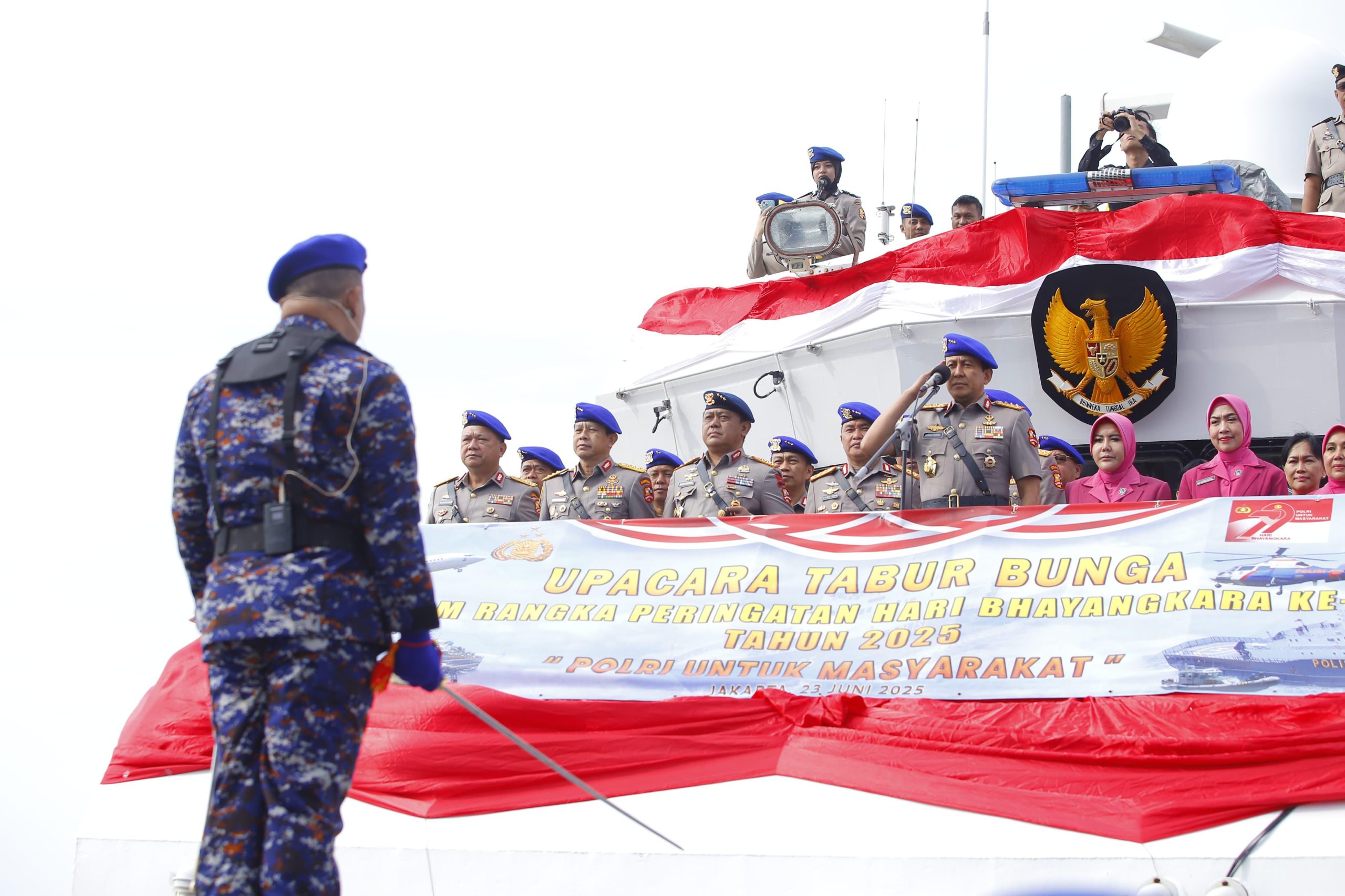 Dalam rangka menyambut Hari Bhayangkara ke-79, Wakil Kepala Kepolisian Negara Republik Indonesia (Wakapolri), Komjen Pol. Dr. Ahmad Dofiri, M.Si., memimpin langsung kegiatan tabur bunga di perairan Teluk Jakarta, Senin (23/6/2025). Kegiatan penuh khidmat ini dilaksanakan di Markas Komando Korpolairud Baharkam Polri, Tanjung Priok, Jakarta Utara.